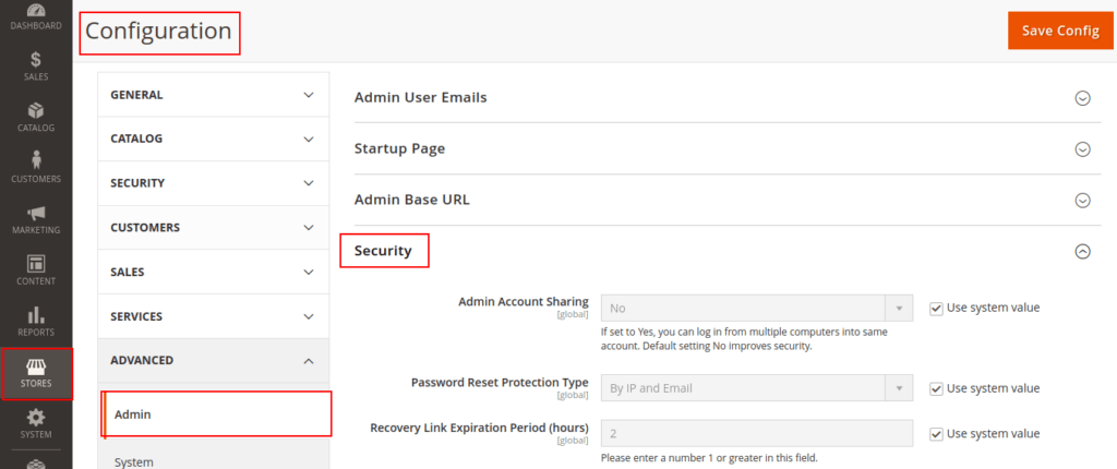 Step 2: Now go to the menu bar on the side. After this, go to Stores > Settings > Configuration.