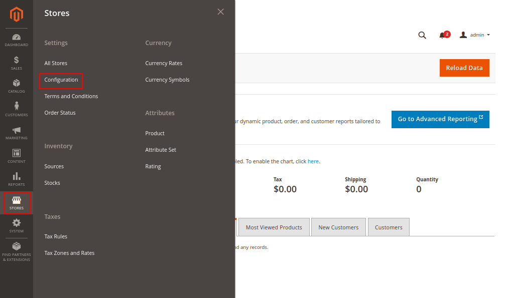 Step 2: Now go to the menu bar on the side. Click on the Stores > Configuration.