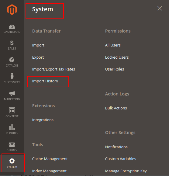 Step 2: Now go to the System > Data Transfer > Import History.